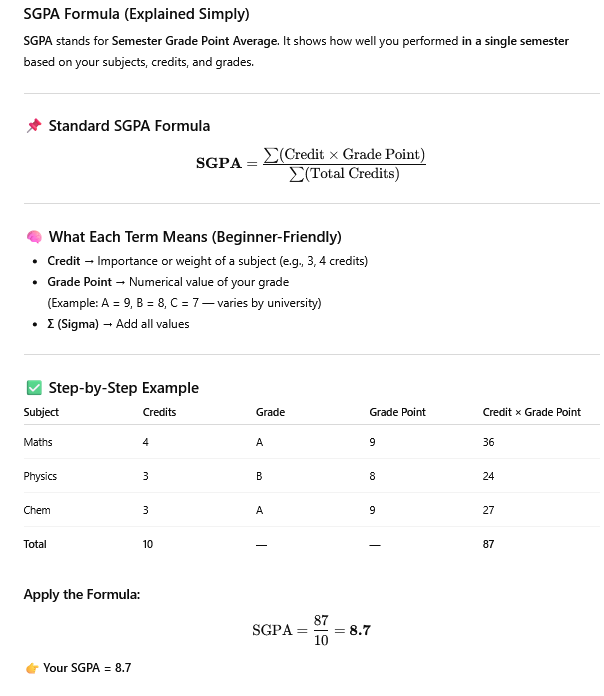Standard Formula: SGPA = Percentage ÷ 9.5.