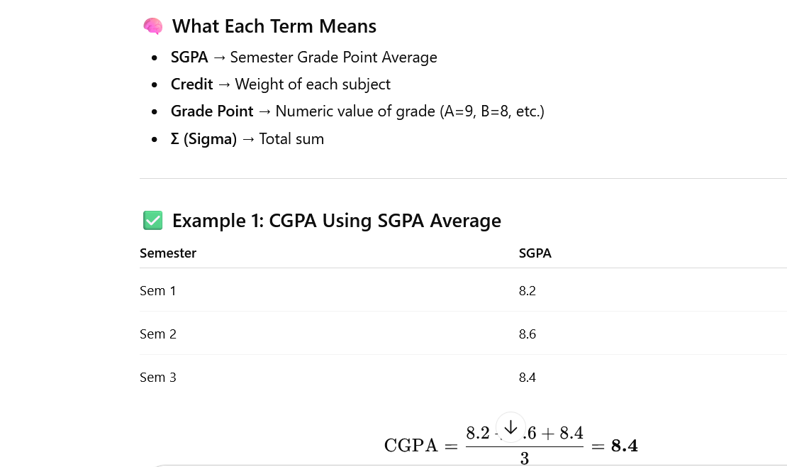Alternatively, if your university follows a direct conversion formula: CGPA=∑SGPANumberofSemestersCGPA = \frac{\sum SGPA}{Number of Semesters}