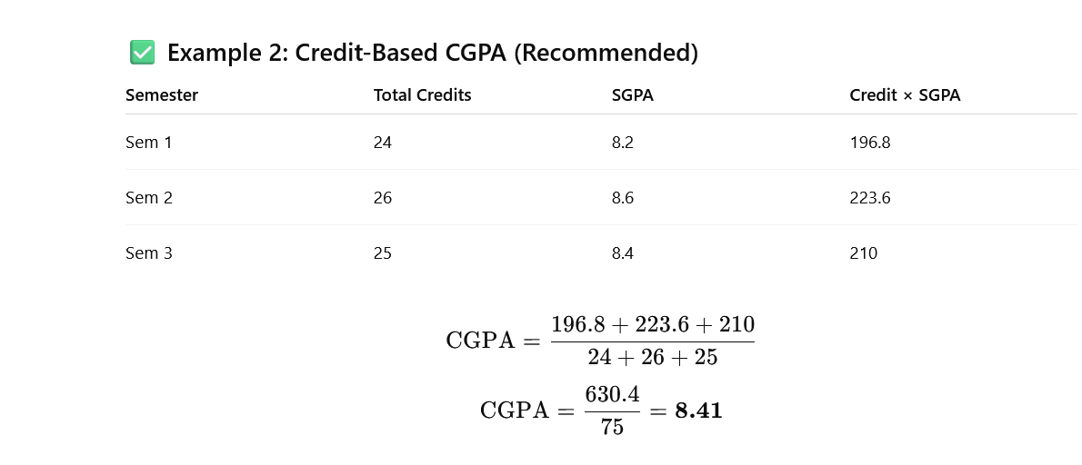 - Divide the total weighted SGPA by the total credits of all semesters.